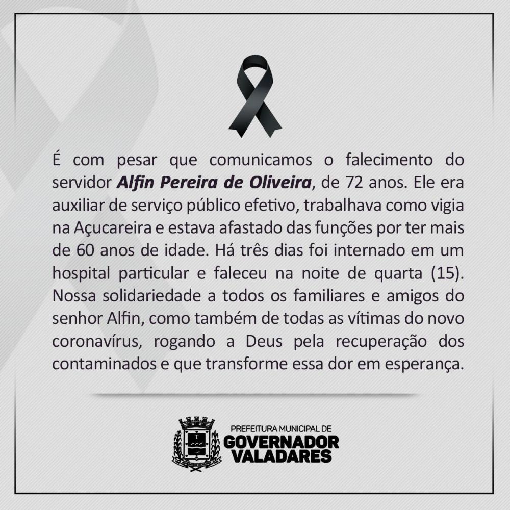 Alfin Pereira de Oliveira de 72 anos, era auxiliar de serviço público efetivo, trabalhava como vigia na Açucareira e estava afastado das funções, por ter mais de 60 anos.