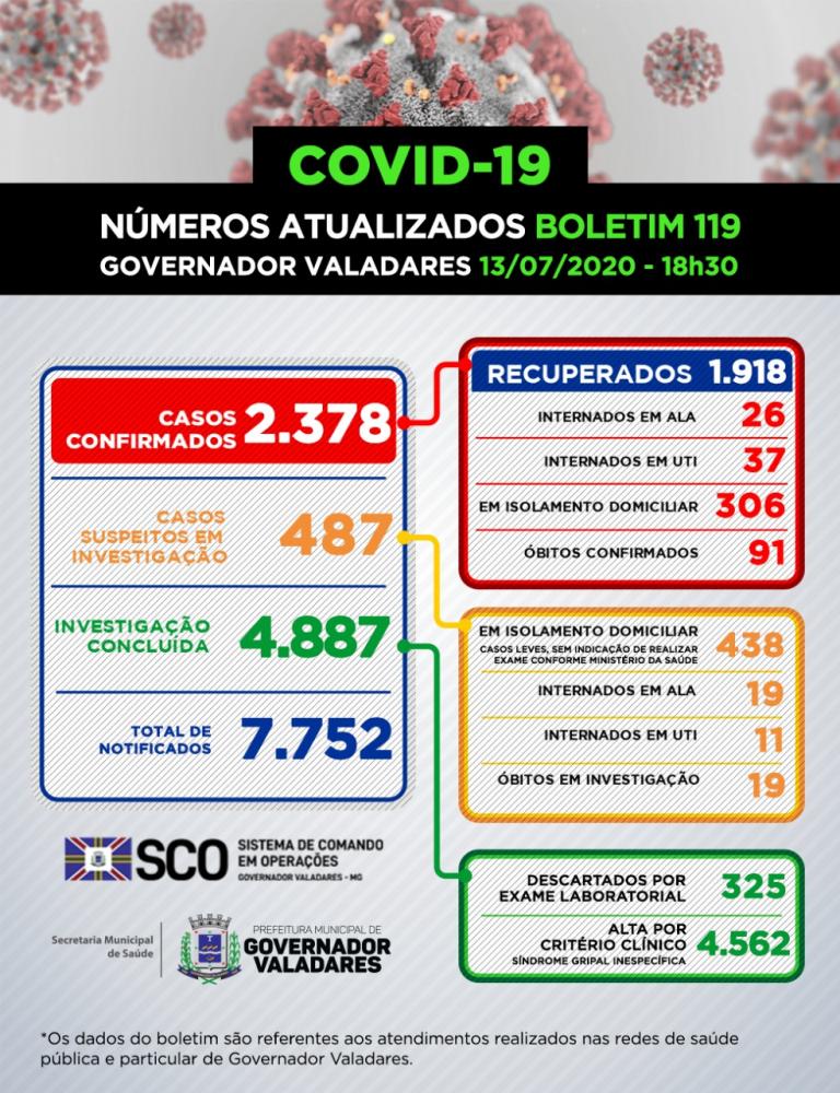Prefeitura de Governador Valadares registra 66 novos casos e mais seis mortes pela Covid-19