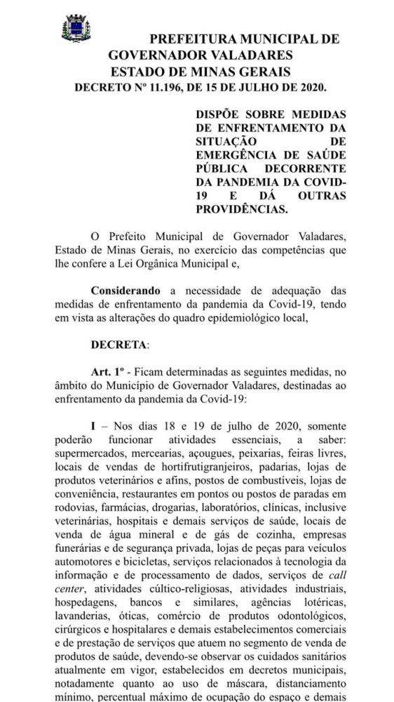 Prefeitura de Governador Valadares lança novo decreto com restrições ao comércio