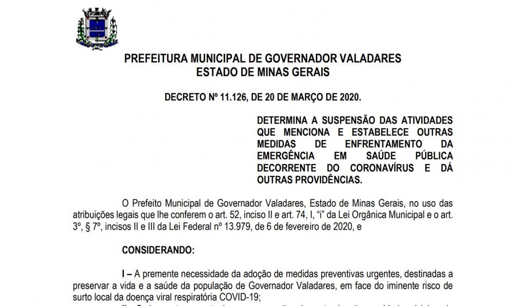 Novo decreto da Prefeitura de Governador Valadares suspende funcionamento de comércio da cidade